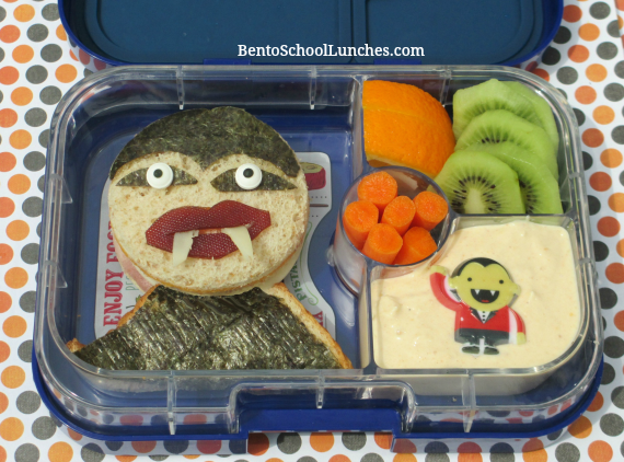 This vampire was fun to create although it's not as handsome as Damon (Ian Somerhalder) of The Vampire Diaries.;) The face was made on a circular cut sandwich by cutting nori in part with circle cutter and part by freehand to shape for the identifying hair style, and the dark behind the candy eyes. The mouth was freehand cut from fruit leather with the vampire fangs made from provolone cheese. The Cape was also cut from nori.